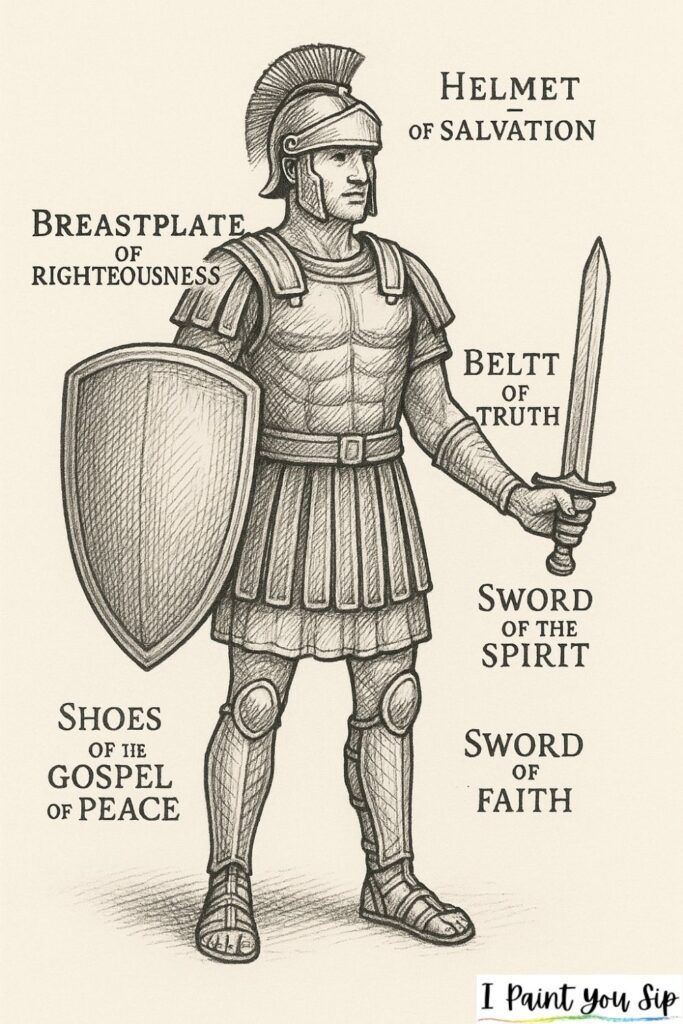 Each piece, helmet, shield, sword, and sandals, can be sketched separately or as a full figure. Try labeling each part (Ephesians 6:10–18) as you draw. It’s both a creative and faith-filled learning moment.