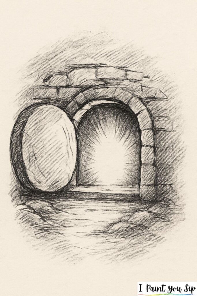 Draw a simple stone doorway with light shining from within. It’s a powerful Easter image and easy to capture with just pencil shading and a sense of contrast between dark and light.