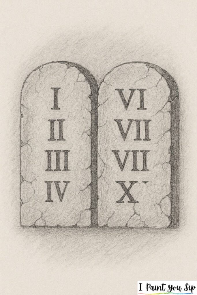 Draw two rounded stone tablets side by side, with Roman numerals I–X. Add cracks or shading to make them look aged and powerful. It’s simple but iconic.