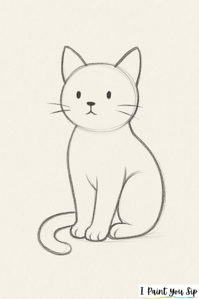 Start with a circle for the head and a larger oval for the body. Add two pointy ears, then sketch a curvy tail wrapped around the paws. Keep your lines light at first, then darken them once you’re happy with the shape.