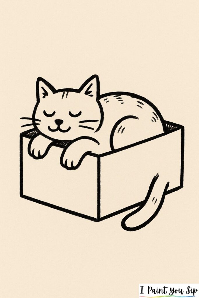 Cats love boxes, so why not draw one? Start with a simple cube, then place a relaxed cat halfway inside. Let a paw or tail hang out, it’s irresistibly cute.