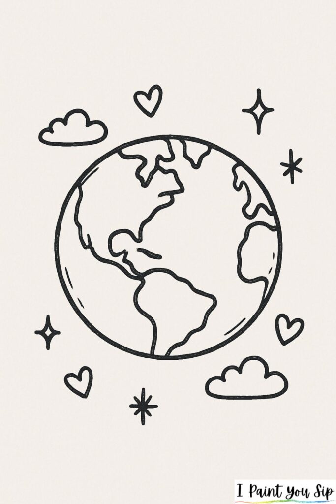Start simple: draw a big circle, then lightly sketch in the continents. Don’t worry about perfect geography, just have fun shaping familiar outlines like North America or Africa. Add clouds, stars, or even little hearts around your planet to make it your own.