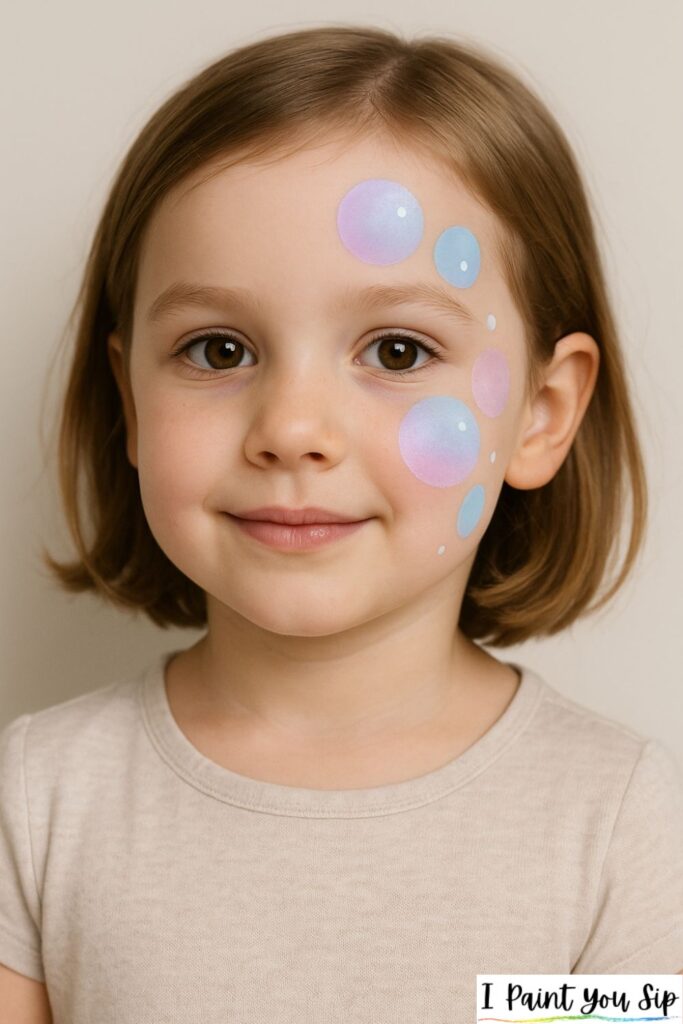 Dip a sponge in pastel colors (pink, blue, lavender) and dab soft round shapes like bubbles. Add small white highlights. This design works beautifully around the eyes or forehead.