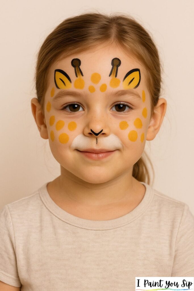 Paint yellow patches across the cheeks and forehead. Add light brown “spots,” a few eyelashes, and a cute nose dot in the center. Super simple, super sweet.