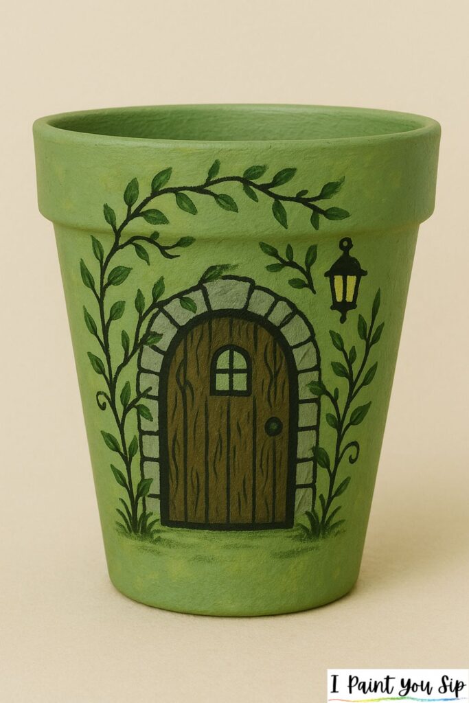 Paint a tiny arched door, a few vines, and maybe a window or lantern. It makes your pot look like a fairy or gnome home.