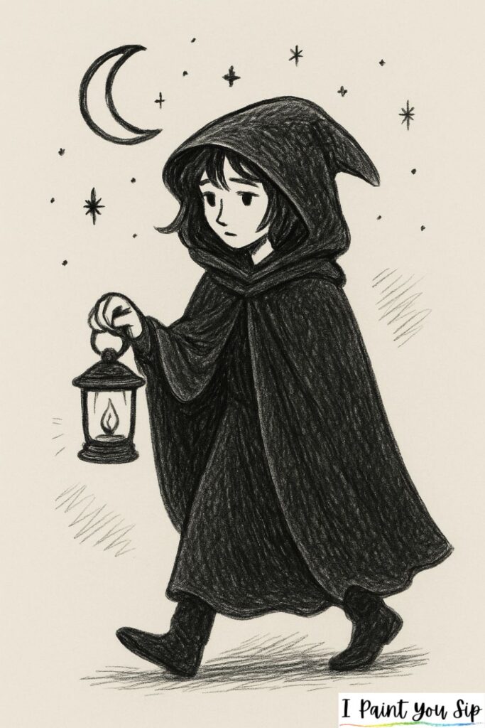 A mysterious figure who walks under moonlight. Cloaks, lanterns, and stars are your best friends here. Keep their expression soft but curious, like they’re searching for something only they can see.