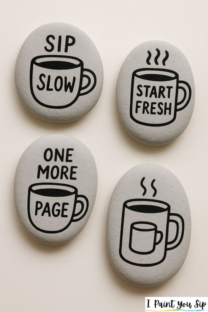 Paint rocks that look like little coffee cups or mugs with words like “sip slow,” “start fresh,” or “one more page.” Perfect for your breakfast nook or home office.
