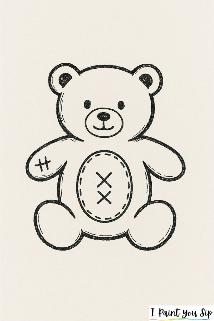 Sketch a cute teddy bear shape and add stitched “patch” marks across its arms or belly. These little lines give your drawing a cuddly, homemade feel.